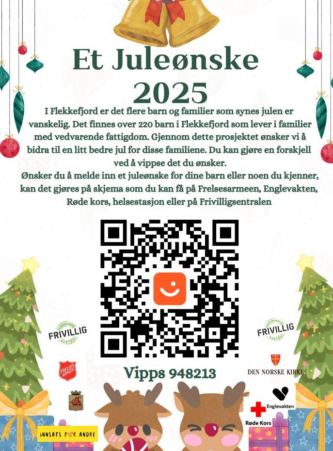 Julen skal være en magisk høytid for alle. Elevene som tar valgfaget «Innsats for andre» er nå i full gang med prosjekt «Et juleønske», som skal sikre at alle barn og unge i Flekkefjord får en fin jul, med julegaver. Vi har etablert en stor arbeidsgruppe som skal sikre at vi kommer i mål til julaften.Prosjektet går ut på at elevene samler inn penger og julegaver til barn og unge fra familier som har en utfordrende økonomisk situasjon. Dette er et samarbeid med Frivilligsentralen, "Innsats for andre" på Flekkefjord ungdomsskole, Røde Kors, Frelsesarmeen, Den norske kirke, Englevakten, Flekkefjord kommune og NAV.