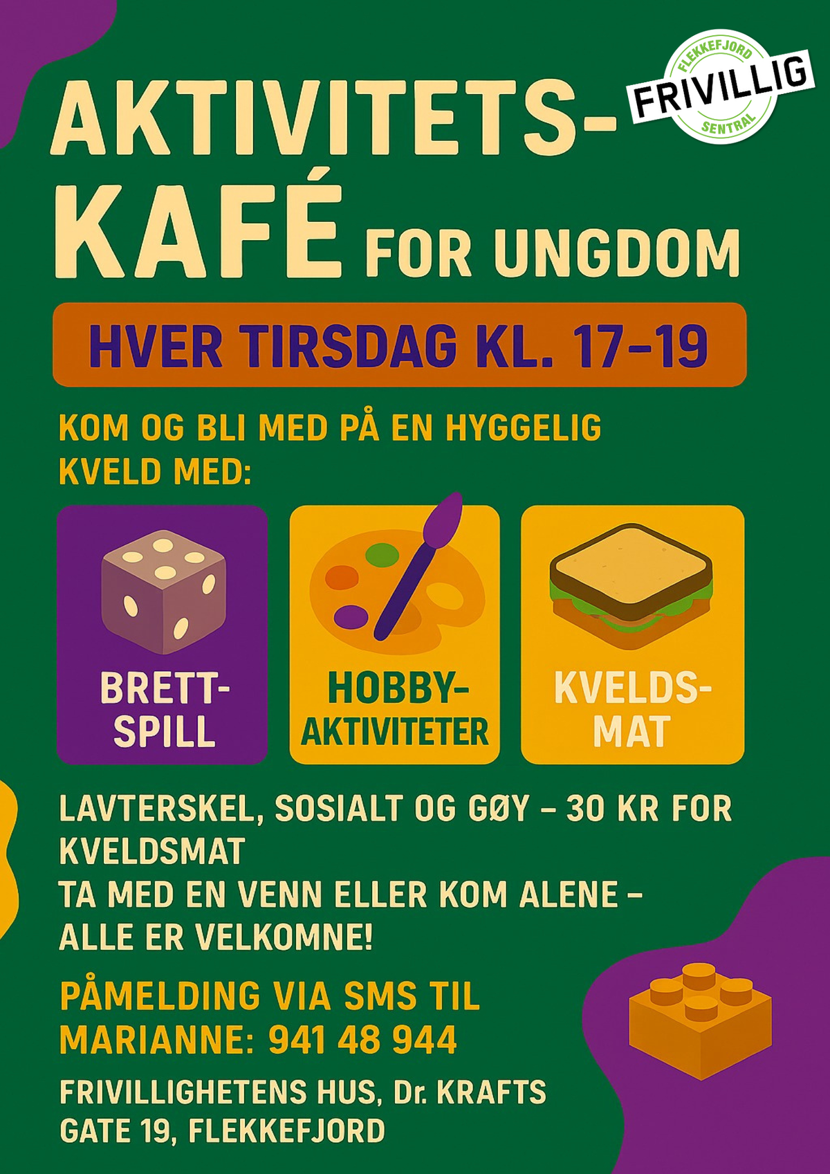 Aktivitetskafe for ungdom. Her kan du spille brettspill, gjøre forskjellige hobbyaktiviteter eller bygge lego. Vi spiser kveldsmat sammen før vi går hjem. Pris 30kr pr person. Aldersgruppe: 15 til 25 år